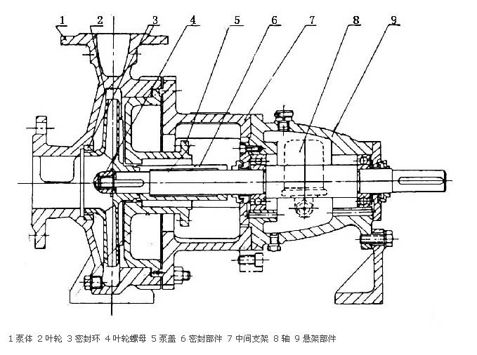 | 1、泵體 | 2、泵蓋 | 3、葉輪 | 4、軸 | 5、密封環(huán) | 6葉輪螺母 |